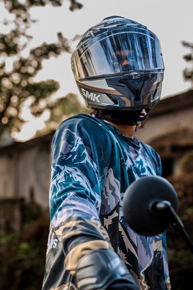 Inspired by the majesty of mountain terrains, its design mirrors the textures and tones of the great outdoors — deep forest greens, earthy browns, and stormy grays layered in an abstract mountain drift pattern. Every contour and shade tells a story of grit, endurance, and connection to nature. The result is not just a riding jersey, but a symbol of exploration and resilience — made for riders who don’t follow paths, but carve their own.