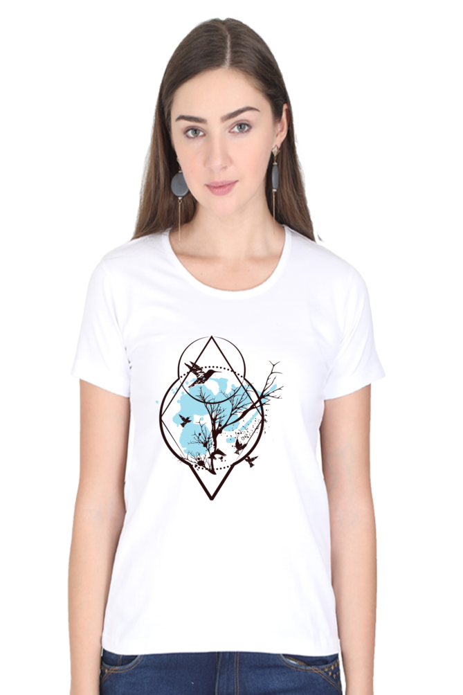 Boho Tree and Flying Birds - Women's Round Neck Half Sleeve T-Shirt